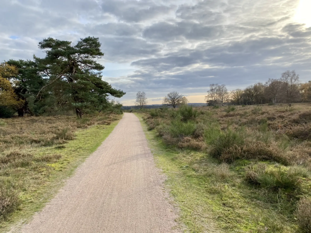 Op een gegeven moment steek je een dwarsweg over, maar dan kun je aan de overkant meteen weer zo’n leuk paadje in duiken. Hier heb je wel iets meer bochtjes, maar het is nog goed te doen zonder gravelbike. Uiteindelijk voert de route over de Zuiderheide bij Hilversum, waarover allerlei paden lopen die bedekt zijn met een compact soort gravel. Ook deze paden zijn stuk voor stuk prima te fietsen met smalle bandjes. Bos en heide worden hier af en toe afgewisseld en soms glooit het terrein licht.